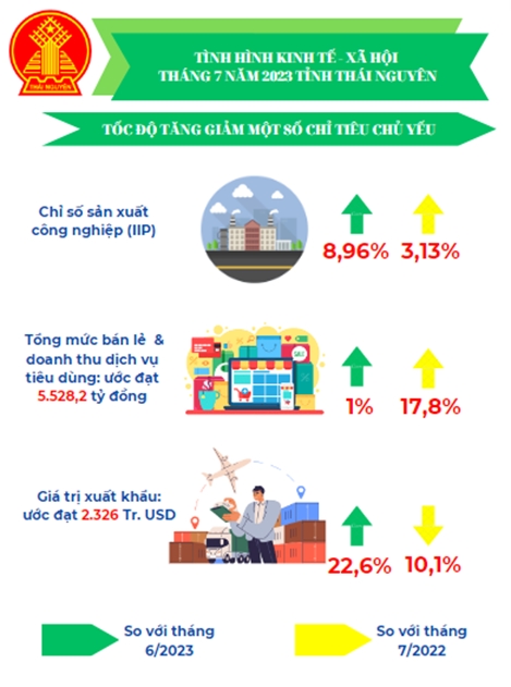 Theo Báo cáo số 2331/BC-SCT của Sở Công Thương ngày 28/7/2023, các hoạt động ngành Công Thương tiếp tục đang tạo đà phát triển cùng với cơ chế, chính sách của Chính phủ và tỉnh Thái Nguyên đã tạo điều kiện không chỉ riêng cho ngành Công Thương mà đồng hành cùng cộng đồng doanh nghiệp kết nối tăng gia sản xuất kinh doanh để đạt được các mục tiêu kế hoạch đề ra. Theo đó, đã đạt được mốt số kết quả trong hoạt động sản xuất công nghiệp trên địa bàn tỉnh như chỉ số sản xuất công nghiệp (IIP) tăng 8,96% so với tháng trước và tăng 3,13% so với cùng kỳ; tổng mức bán lẻ hàng hóa và doanh thu dịch vụ tiêu dùng ước đạt 5.528,2 tỷ đồng, tăng 17,8% so với cùng kỳ; giá trị xuất khẩu ước đạt 2.326 Tr.USD, tăng 22,6% so với tháng trước. Cùng với đó, một số sản phẩm công nghiệp chủ yếu tăng so với tháng trước như điện thoại thông minh ước đạt 7,4 Tr.SP, tăng 5,93% nhưng giảm 16,52% so với cùng kỳ; camera truyền hình ước đạt 5,53 Tr.SP, tăng 4,79% và tăng 7% so với cùng kỳ; sắt thép các loại ước đạt 97,9 nghìn tấn, tăng 4,28%...