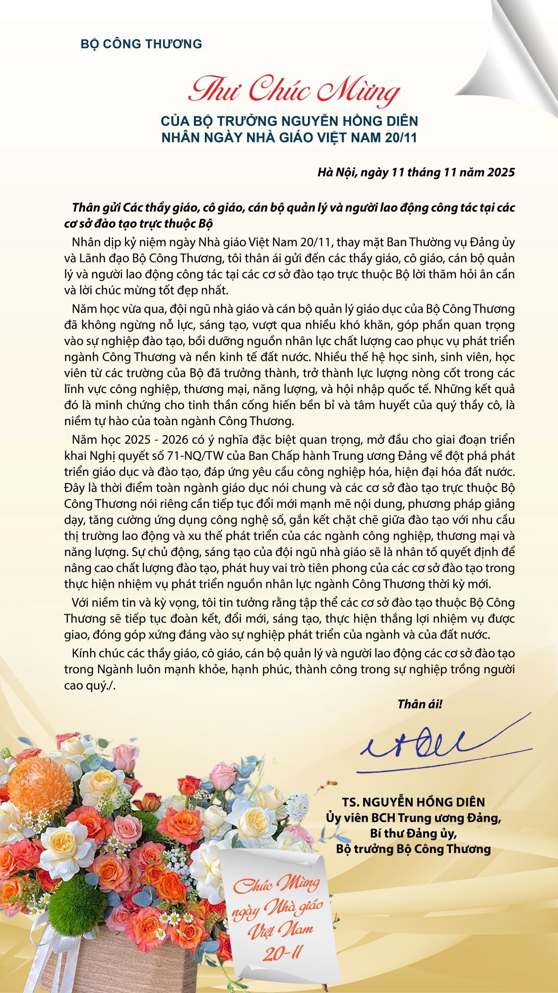 Nhân dịp kỷ niệm ngày Nhà giáo Việt Nam 20/11, thay mặt Ban Thường vụ Đảng ủy và Lãnh đạo Bộ Công Thương, Bộ trưởng Nguyễn Hồng Diên đã gửi thư chúc mừng đến các thầy giáo, cô giáo, cán bộ quản lý và người lao động công tác tại các cơ sở đào tạo trực thuộc Bộ lời thăm hỏi ân cần và lời chúc mừng tốt đẹp nhất.
