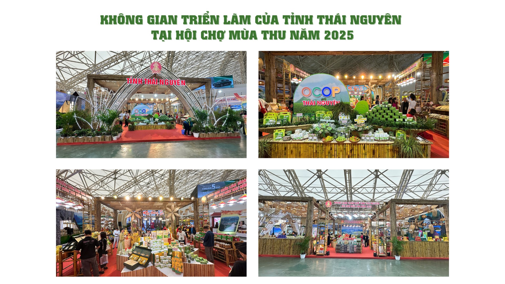 Giữa không gian rực rỡ của Hội chợ Mùa Thu 2025, gian triển lãm của tỉnh Thái Nguyên nổi bật như một điểm nhấn văn hóa độc đáo, thu hút đông đảo du khách và đối tác quốc tế. Dưới sự chỉ đạo của UBND tỉnh, Sở Công Thương (Trung tâm Xúc tiến Thương mại tỉnh Thái Nguyên), không gian trưng bày giới thiệu hàng nghìn sản phẩm tiêu biểu như chè Tân Cương, trà hữu cơ, miến Việt Cường, sản phẩm OCOP, nông sản đặc trưng và hàng công nghiệp tiêu dùng chất lượng cao.